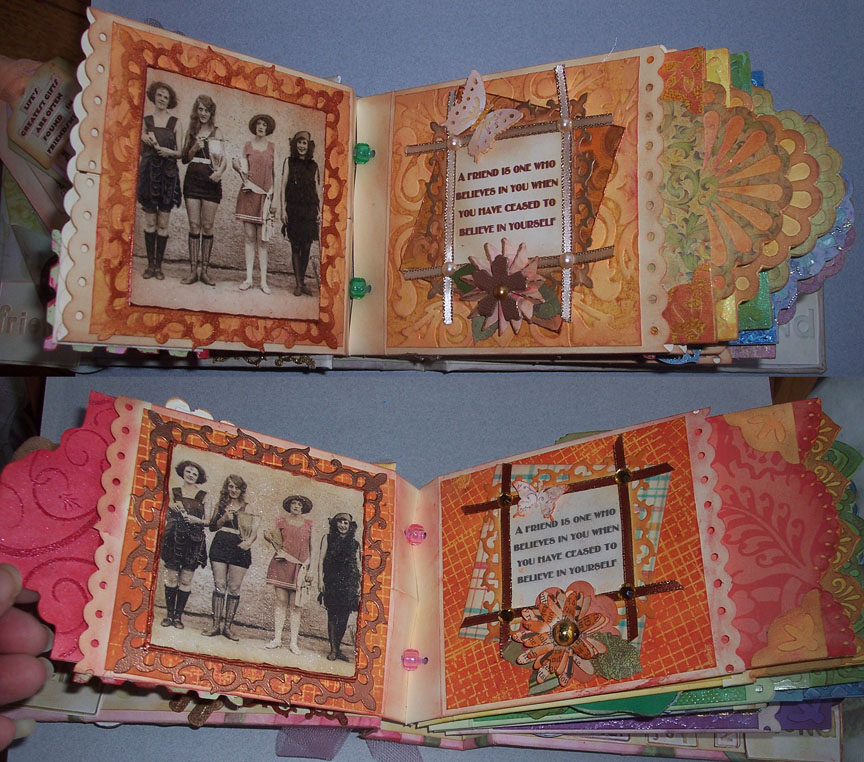 The frames around the ladies are braid covered with Ranger Glossy Accents. All the insert pages started out solid colors then were stamped with Stampers Anonymous (Tim Holtz) Music, or flourish stamps, clear EP, then colored with distress inks.